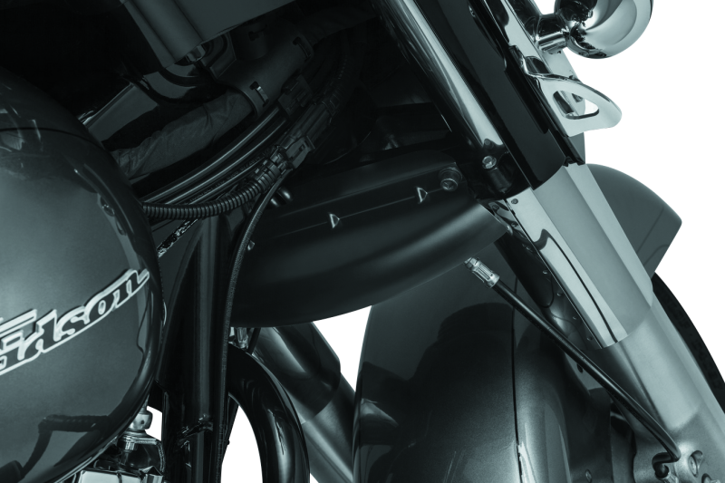 Kuryakyn's Lower Triple Tree Wind Deflectors direct wind passing through the fork legs downward to reduce upward airflow between the tank and fairing on H-D® Touring models.