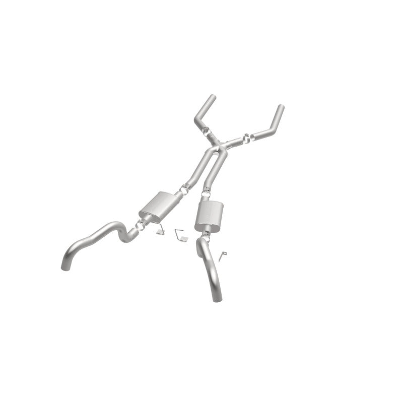 The MagnaFlow Street Series Crossmember-Back Performance Exhaust System 15899 brings enhanced engine sound and dyno-proven performance to your muscle car with a healthy helping of our deep, resonant signature exhaust note at Aggressive exterior and Moderate interior sound levels. Thanks to its durable, corrosion resistant stainless steel design, this exhaust system will handle whatever tarmac you decide to leave your mark on. This performance exhaust kit features a crossmember-back layout designed to replace your exhaust system from the crossmember on back. With its fast-flowing, mandrel bent 3in. main piping and 2 Straight-Through mufflers ending in a Dual Split Rear exit that you can enhance with tips of your choosing, your muscle car will be sounding as awesome as it looks. Extensive 3D scanning during development has resulted in a direct-fit design that you can easily install yourself. 15899 is produced using CNC precision robotic manufacturing techniques and is backed by MagnaFlow's limited lifetime construction warranty.