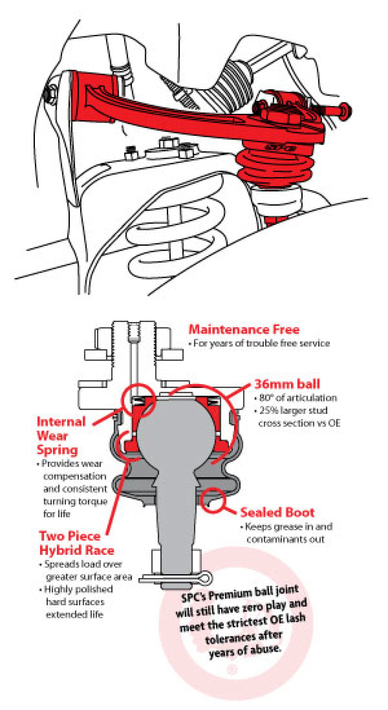 Improve droop travel, drivability and tire wear as well as adjusting tire position in your wheel well with SPC's adjustable front upper control arms for the Frontier, Pathfinder, and Xterra. Featuring our long life maintainable ball joint and SpecRide bushings, this arm is designed to correct alignment angles while maintaining factory ride quality. SPC's integrated tubular and cast steel design provides the strength and durability needed for the most demanding environments. These remove and replace armsare available in pairs for lifted and off-road applications. Get more droop travel: SPC's arm has improved clearance to get around the spring bucket when the arm droops, eliminating arm to frame contact on lifted trucks. The maintainable ball joint has an oversized ball and allows more than 80deg of articulation to ensure it never binds. SpecRide bushings have free pivot to eliminate any chance of bushing failure seen on many high travel suspensions. Get your drivability and tracking back: When you lift your truck you affect caster and camber. SPC's arms have +1deg of caster built into them. Using its patented ball joint design the arm will get you -1deg to +3deg of caster and +-2deg of camber. Get your tire where you want it in the wheel well: Use adjustment in the control arm and on the OE lower cams to maximize alignment angles and move oversized tires forward in the wheel well to minimize or avoid fender trimming. To make installation easier, SPC now includes a bolt to replace the driver's side rearward bolt, which often needs to be cut out to remove the original arm. If you need more bolts for the other positions order p/n 21035 replacement bolt kit (2 bolts). Do you need replacement cams for the lower controlarm? Check out SPC p/n 87520, which will replace corroded cam bolt assemblies, or can be used on trucks not equipped with factory cam bolts for the lower control arm. These cams should be used with the upper arm kit